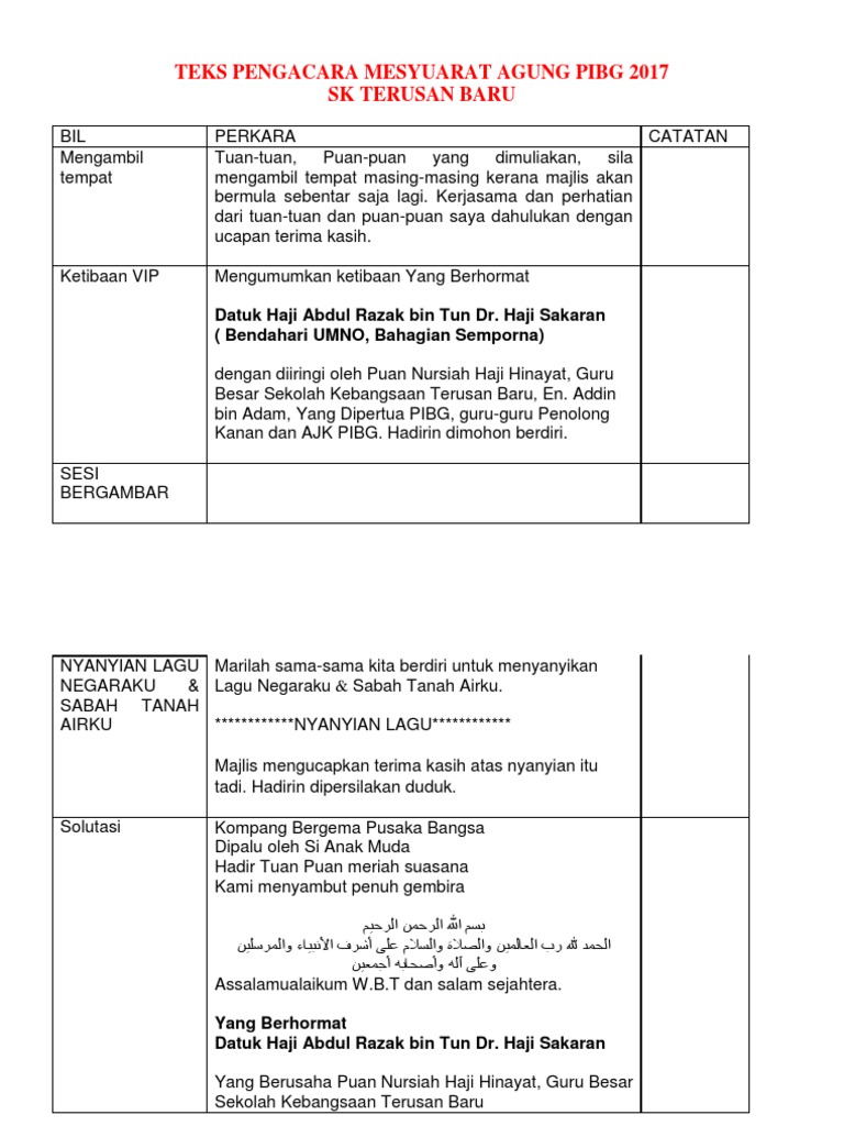 Teks majlis kuarter draf ucapan perasmian majlis anugerah cemerlang dan mesyuarat agung pibg smk cheras jaya tahun 2009. Encik zulkifli bin hamzah timbalan ketua pengarah.saudara/i pengacara majlis; Teks pengacara majlis hari guru. Mungkin mereka yang tidak dapat hadir ada kerja yang perlu diuruskan. Mesyuarat agung pibg smk tapah telah berlangsung pada 23 mac 2009. Pelbagai aktiviti telah dijalankan bagi memeriahkan lagi majlis tersebut. Di pamerkan semasa mesyuarat agung pibg. Beginilah sambutan ibubapa dalam mesyuarat agung yang telah dijalankan di sekolah. Ketibaan mengumumkan ketibaan yang berhormat en khoo soo seang para (ahli parlimen tebrau) dengan diiringi en. Lawatan penanda aras 3k (kantin). Teks pengacara majlis mesyuarat agung pibg sk indera mahkota,kuantan. Yang berhormat datuk haji mohd ariffin bin. Pengacara terbaik, contoh dokumen hukum.