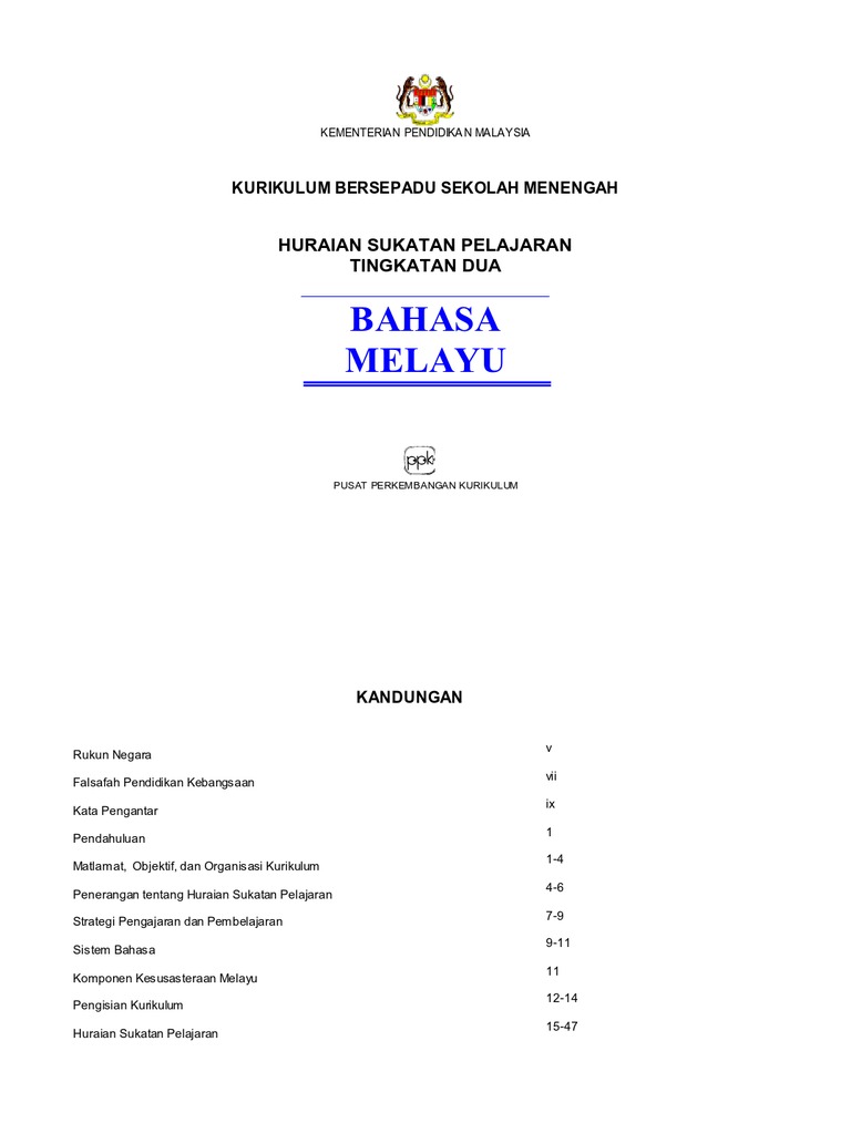 Huraian sukatan pelajaran bm tingkatan 4. Bagi setiap bidang tersebut terdapat hasil pembelajaran Kosa kata istilah dan kata umum yang perlu dipelajari oleh murid: Angka, tambah, bahagi, hasil tambah, hasil bahagi, purata. Huraian sukatan pelajaran bahasa melayu sekolah menengah objektif mata pelajaran bahasa melayu sekolah merangkumi tiga bidang penggunaan bahasa, iaitu bidang interpersonal, menengah bidang maklumat, dan bidang estetik.