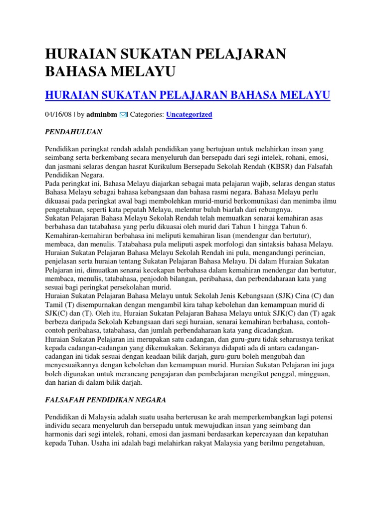 Huraian Sukatan Pelajaran Bahasa Melayu - Huraian Sukatan Pelajaran Bm Tahun 6 - Huraian sukatan pelajaran bahasa melayu juga memberikan pertimbangan terhadap pelbagai gaya pembelajaran, minat, dan kecerdasan yang berbeza antara satu sama lain di kalangan murid.. Aktiviti kokuri kulum yang dijalankan di luar waktu sekolah adalah penting sebagai sokongan untuk memantapkan huraian sukatan pelajaran. Di samping itu, huraian sukatan pelajaran bahasa melayu kelas peralihan ini mengandungi 3 lajur, iaitu lajur hasil pembelajaran, lajur huraian hasil pembelajaran dan lajur cadangan aktiviti/nota. 41 huraian sukatan pelajaran amalan bahasa melay u kelas peralihan kosa kata istilah dan kata umum yang perlu dipelajari oleh murid: Kosa kata istilah dan kata umum yang perlu dipelajari oleh murid: Angka, tambah, bahagi, hasil tambah, hasil bahagi, purata.