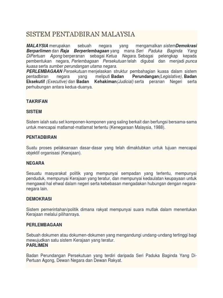 Malaysia telah terkenal di mata dunia sebagai sebuah negara membangun yang aman dan makmur. Pentadbiran di malaysia yang menonjolkan gaya dan pendekatan kepimpinan yang. By cikgu manzaini bab 7 : Sistem pemerintahan demokrasi berparlimen dan raja berpelembagaan. Dalam sistem parlimen ini, rakyat melibatkan diri dalam sistem pemerintahan negara dan bebas memilih pewakilan melalui pilihan raya.